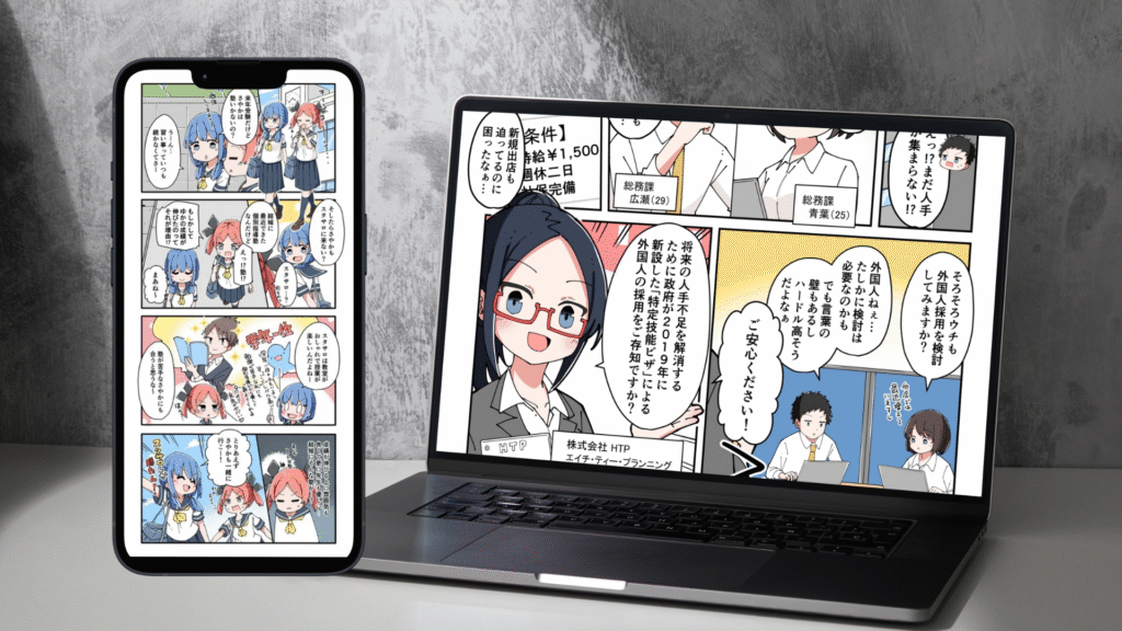 4コマや冊子マンガはもちろん、LP差し込み用やSNS用の縦読みマンガ、公式ライン用途、Webtoon形式、動画用マンガなど、どんな形式のご依頼にも対応可能。活用先媒体に合わせて最適な形式をご提案します。